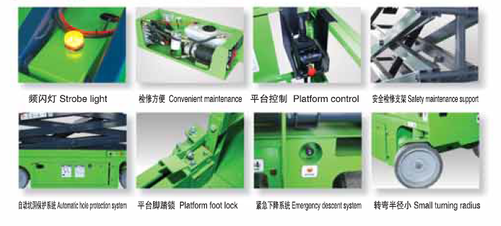 自行剪叉式升降平臺具有自動行走功能,整機(jī)一體式設(shè)計,內(nèi)置電瓶電源,滿足在不同工作狀態(tài)下,不需外接電源,不需外來動力牽引即可升降自如,而設(shè)備的行走轉(zhuǎn)向也只需一人便可完成。操作人員只需掌握好設(shè)備前的控制手柄即可完成設(shè)備前進(jìn)、后退、轉(zhuǎn)向、快、慢速行走和上下等動作。自行剪叉式升降平臺移動靈活,操作方便、省工、省力令高空作業(yè)更方便快捷,是現(xiàn)代企業(yè)高效安全生產(chǎn)之理想高空作業(yè)設(shè)備。