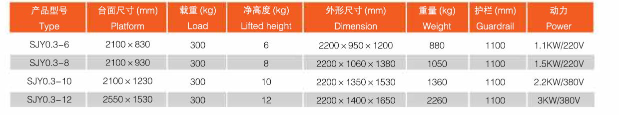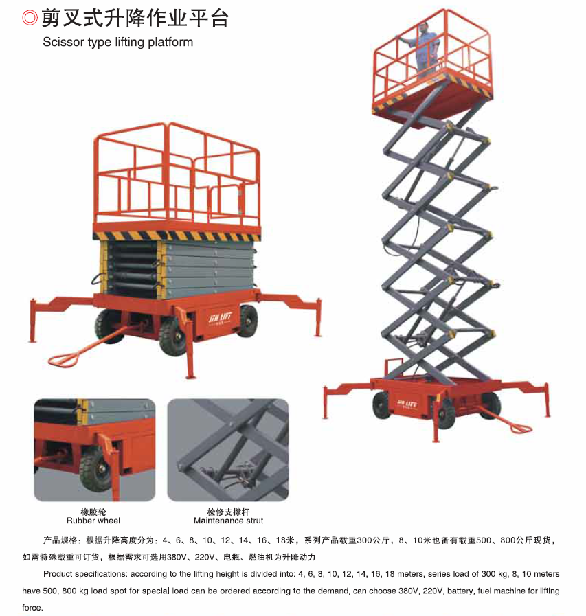 產(chǎn)品規(guī)格:根據(jù)升降高度分為4、6、8、10、12、14、16、18米,系列產(chǎn)品載重300、500公斤。其他載重需另外定做。